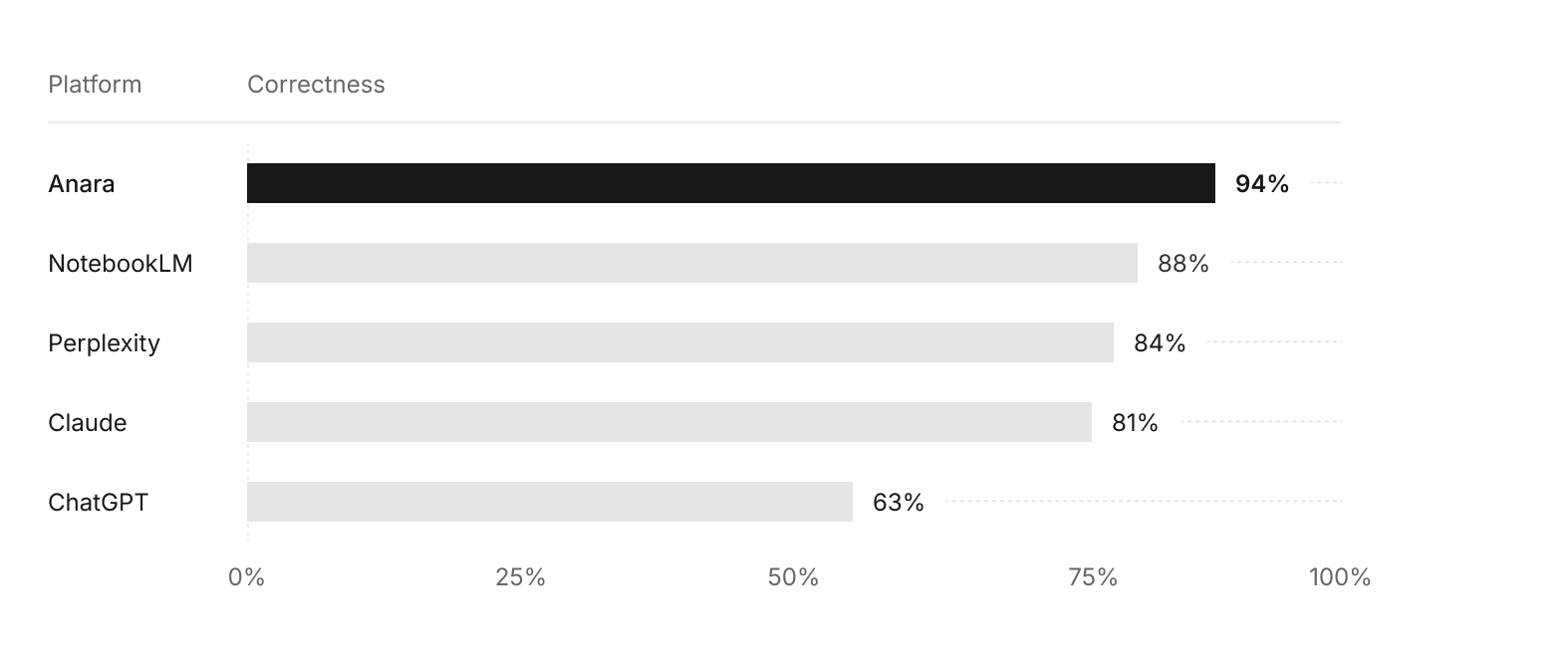 Anara 3.0 answers more questions correctly than every other platform tested, including ChatGPT and NotebookLM.