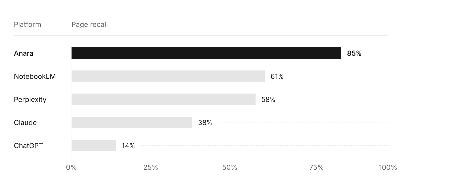 Anara 3.0 scores 97% higher than the average of all other platforms tested (43%) at locating the exact page containing the answer.